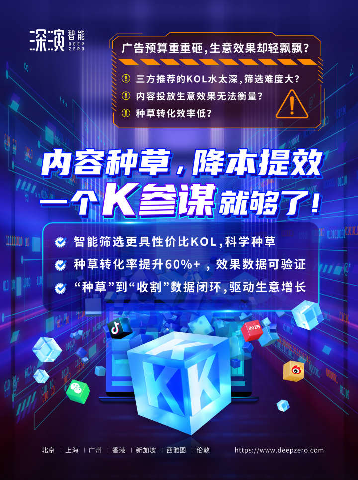 创世红海智能K参谋科学前选,可跨领域找到最能影响品牌目标TA人群的KOL进行投放,同时有效平衡投资回报率;内容营销数据可同电商后链路平台打通,进行数据归因分析,准确判断KOL影响的用户是否真实在电商平台产生购买行为;实现“种草”到“收割”链路闭环,轻松内容营销,可根据品牌方的业务需求提供一站式的KOL采买及数据验证服务,有利提升整体内容营销的效率与效果。